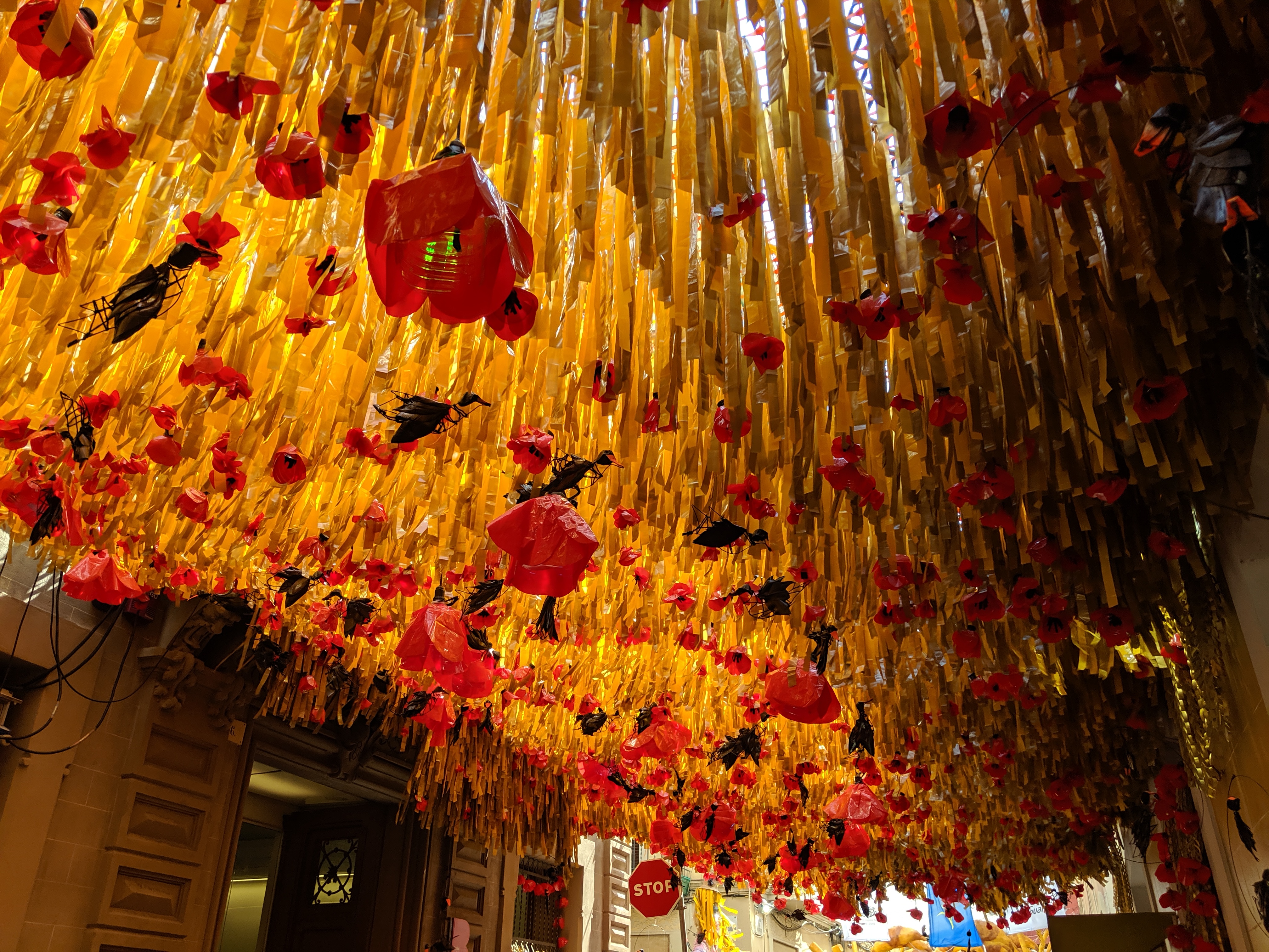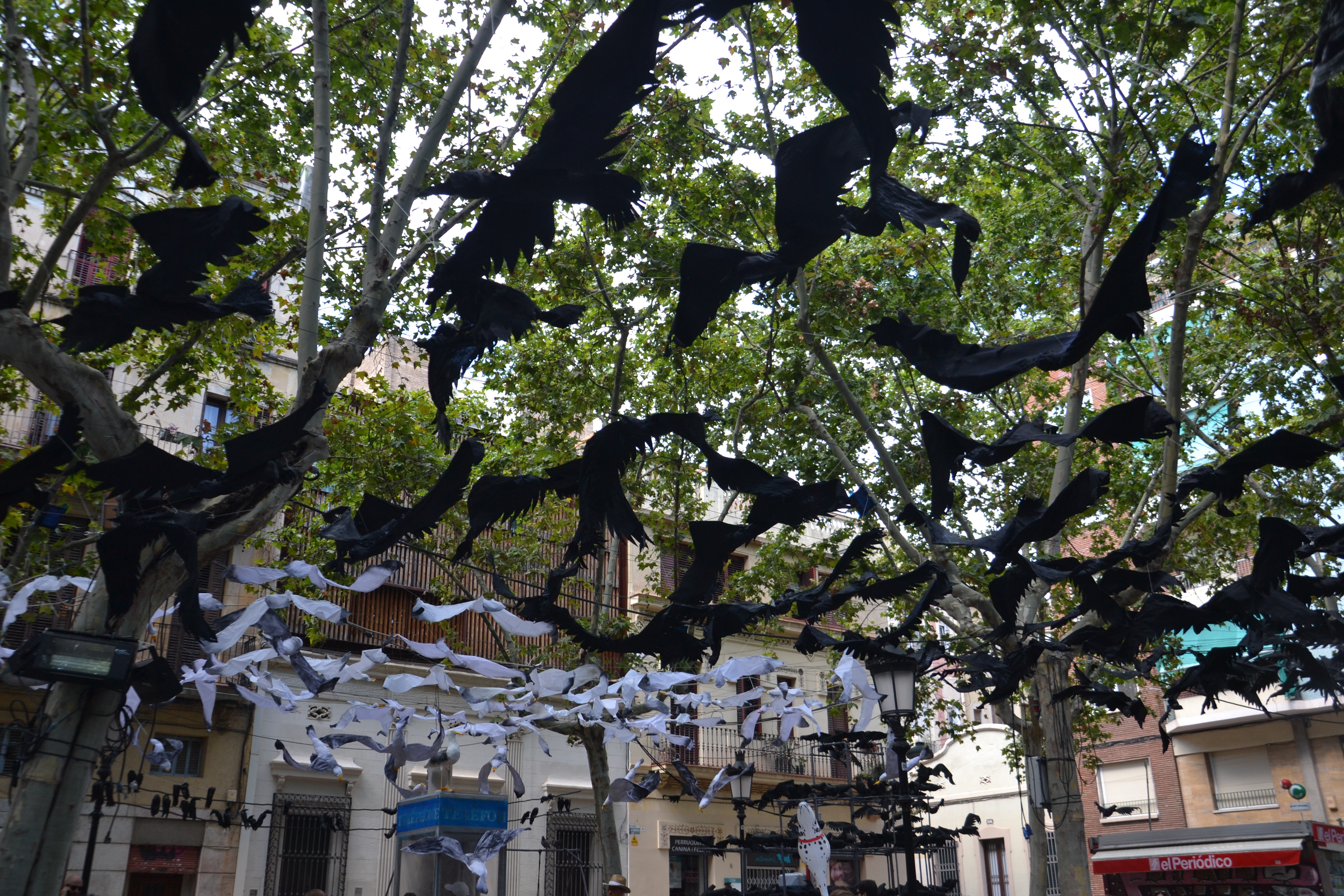Dernière fête avant le départ, celle de Gracia, quartier où j’habite. Une ville ancienne rattachée à Barcelone en 1897. Les rues sont décorées par les habitants avec des matériaux de récupération afin d’immerger le passant dans un univers de fantaisie. Dans l’une, on suit l’itinéraire de la route de la soie, de la Chine à la Turquie en passant par la Mongolie, dans une autre, celle de la farine, des champs au moulin et au pain, ou encore des couleurs, des pigments bruts aux pots de peinture. Puis on plonge sous un vaisseau viking, entre ses filets garnis de poissons frais, ou on évite une pluie drue de carottes et d’aubergines. Sur les places, nous voilà assaillis par les oiseaux d’Hitchcock ou face à face avec un dragon de carton pâte.