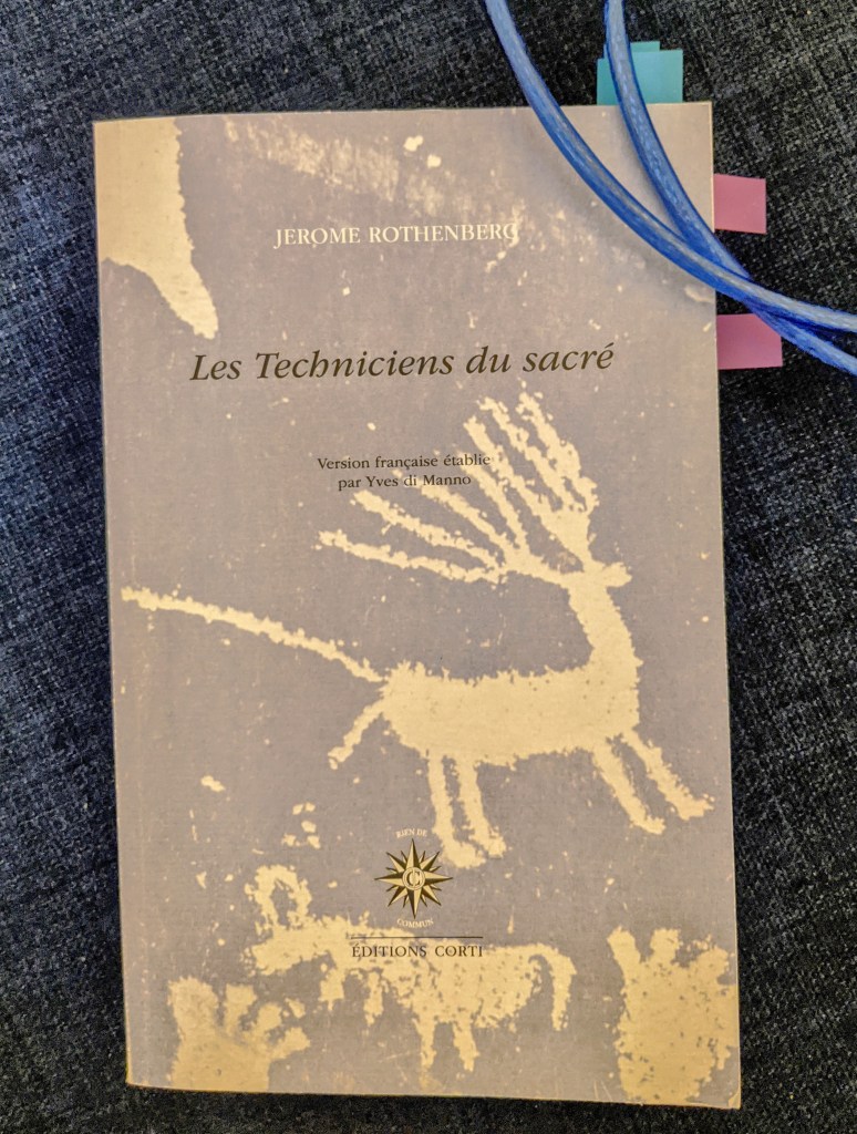 Il est à la mode, ces temps-ci, de qualifier les écrivains de chamans. Mode aux multiples déclinaisons, celle du retour au sauvage, de la magie réinvestie, etc. Aller contre la mode, c’est la suivre à reculons – et j’aime bien les cabanes et les potions, pourquoi pas… Mais à force de répétition, ces mots perdent prise sur la réalité qu’ils désignent et qui est ici exposée exhaustivement. Rothenberg tente, autant que possible, d’éviter toute réduction de l’altérité à ses propres fins. Il précise qu’il mentionne les chamans « non pas pour leur ravir ce titre, mais comme modèle de mise en forme du sens & de l’énergie qui circulent par le biais du langage ».